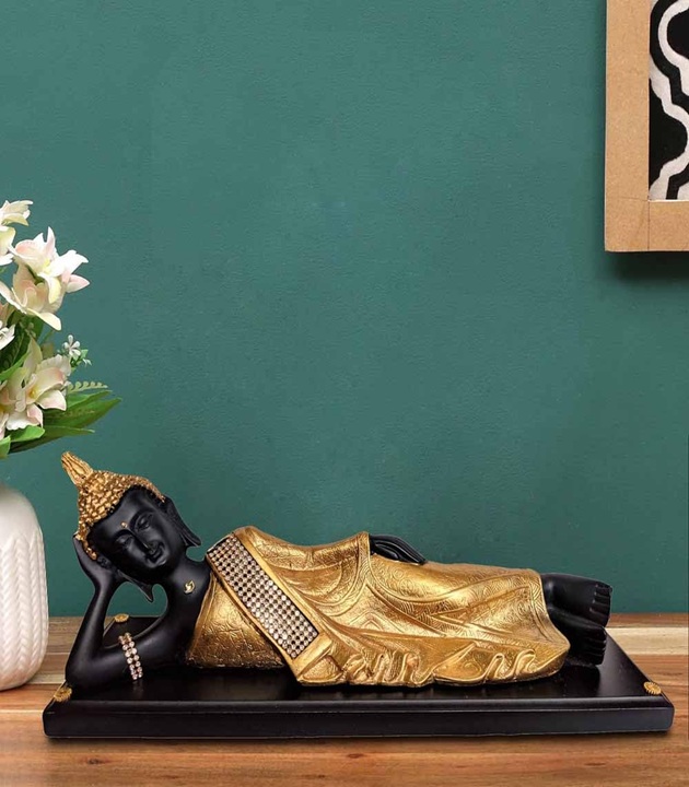 लकड़ी के बेस पर हाथ से बनी एंटीक काले-सुनहरे रंग की सोते हुए बुद्ध की मूर्ति, जो शांति और सुकून का प्रतीक है। घर की सजावट, मेडिटेशन की जगहों या शांति और पॉजिटिव एनर्जी गिफ्ट करने के लिए एकदम सही।